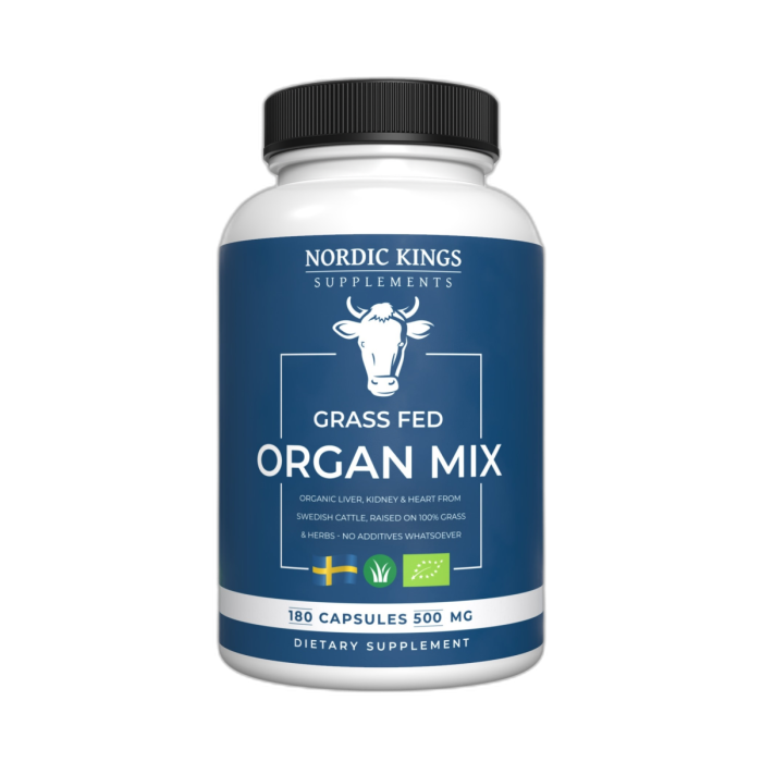 Ekologiczna mieszanka organów z szwedzkich bydła wypasanego na trawie. Organmix Gräsbetad jest ekologicznie certyfikowana z równomiernym rozkładem wątroby, nerki i serca. Organmix Gräsbetad pochodzi od zwierząt, które były hodowane na 100 % trawie i ziołach. Nie otrzymują 0 % paszy zbożowej (soja, pszenica, kukurydza). Organmix Gräsbetad jest delikatnie liofilizowana, aby zachować wysoką wartość odżywczą. Organmix Gräsbetad jest całkowicie wolna od antybiotyków, hormonów wzrostu i pestycydów. Jest całkowicie wolna od alergenów. Organmix Gräsbetad nie zawiera żadnych dodatków, wypełniaczy ani substancji wiążących. Organmix Gräsbetad zawiera tylko liofilizowaną, bogatą w składniki odżywcze wątrobę, nerki i serce z bydła.