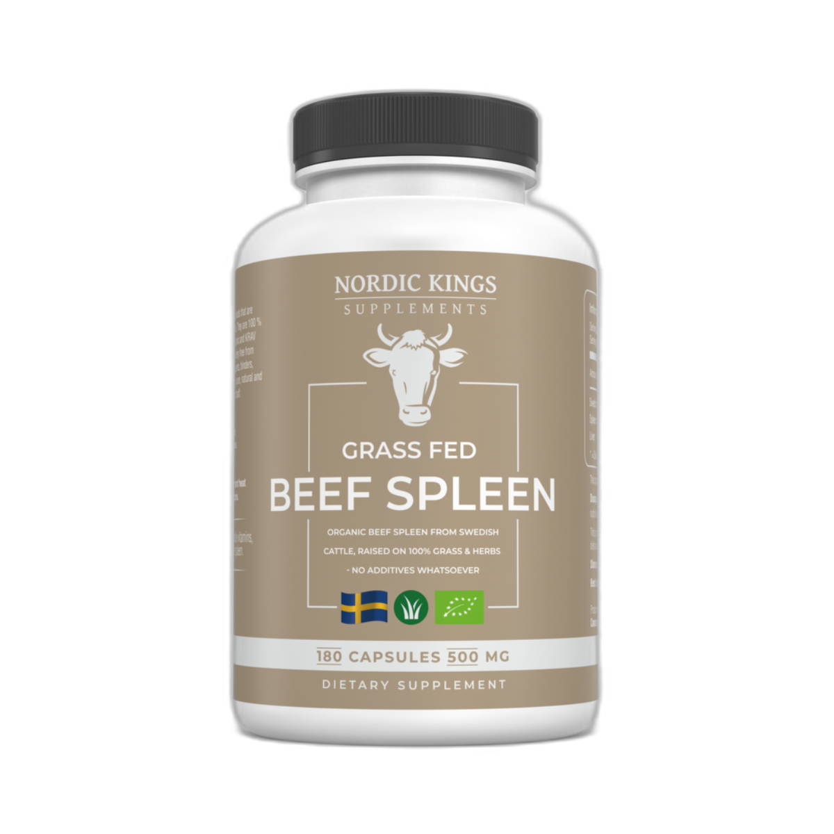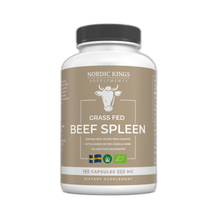 Ekologiczna śledziona od szwedzkich bydła wypasanych na trawie. Nötmjälte Gräsbetad jest ekologicznie certyfikowana. Nötmjälte Gräsbetad pochodzi od zwierząt, które były hodowane na 100 % trawie i ziołach. Zwierzęta nie otrzymują 0 % paszy zbożowej (soja, pszenica, kukurydza). Nötmjälte Gräsbetad jest delikatnie liofilizowana, aby zachować wysoką wartość odżywczą. Ekologiczna Nötmjälte zawiera również niewielką ilość wątroby od bydła wypasanego na trawie, ponieważ kofaktory w wątrobie przyczyniają się do wysokiego wchłaniania żelaza zawartego w śledzionie.